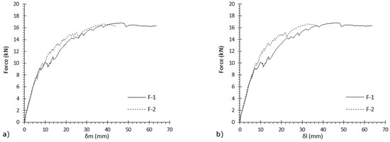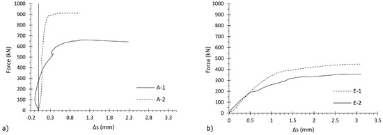The load–deflection curves (Figure 12) overlap during the elastic phase. Furthermore, no significant difference is observed for the ultimate load, although different values of ultimate displacement were registered, showing that panels had different dissipation performances.