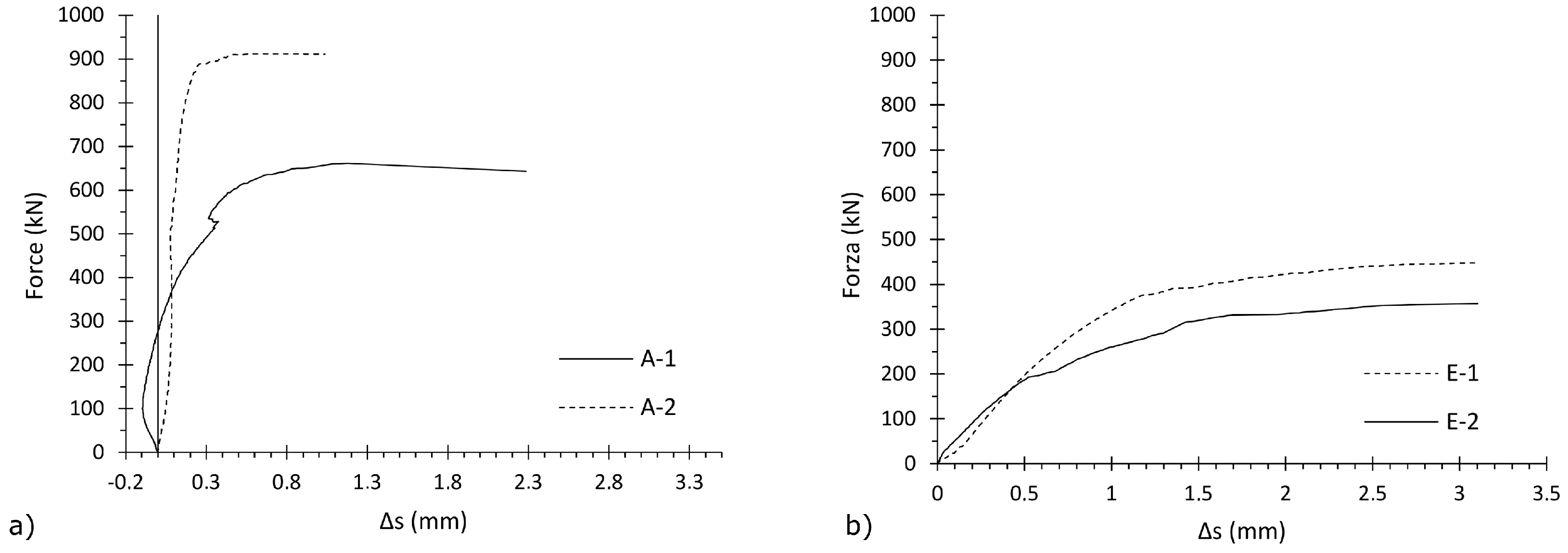 In this section, results of the axial and eccentric compression tests and then the results of flexural tests are reported and discussed. Table 4 shows the ultimate load and vertical displacement registered during the compression tests.