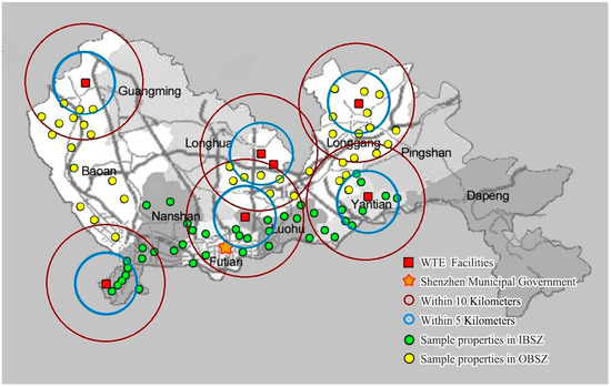 Firstly, this paper makes full use of public information resources to construct a new micro-data set for our sample city (Shenzhen) and uses the hedonic price model to analyze residents’ MWTP for LULU facilities. In fact, since the welfare housing system was abolished in 1998, the real estate market has flourished [33]. On this basis, many domestic scholars have carried out property studies with the hedonic pricing method to estimate families’ MWTP for property attributes [34,35,36,37,38,39]. Our study, which analyzes the negative impacts of WTE plants upon the adjacent property value in China, is an important complement to the previous literature. The results of this study have policy implications for government to properly assess residents’ MWTP for WTE facilities such as the issues about site selection and mediating public disputes. Shenzhen city is one of the most prosperous real estate markets in China. In this study, a total of 2119 real estate transaction data is selected in different districts in Shenzhen city from June 2013 to March 2015. The hedonic price model is adopted to estimate the effects resulting from the distances between WTE plants and houses on property values. By means of regression analysis, results confirm that this public facility does have a negative impact on local housing prices; the premium effect of the property for each additional kilometer away from the facility is about 1.30%. However, if the distance is restricted to within 5 km, the effect rises to 8.6%, which remarkably increases negative externality.