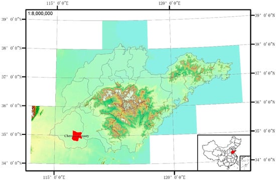 Chengwu County is located in the southwest of Shandong Province, north China (Figure 1). Chengwu covers an area of 988.3 km2 and is found within 115°43′57.6″E–116°10′07.5″E, and 34°48′21.8″N–35°09′44.0″N. Chengwu is located in an alluvial plain of the Yellow River, thus has flat topography. The average altitude is 45.5 m above sea level. The climate is a typical temperate climate: four distinct seasons, sufficient rainfall, and hot in summer. Agriculture is the primary industry of Chengwu.