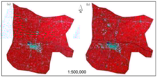 Landsat 8 OLI images of Chengwu County: (a) image in 2013; and (b) image in 2015.