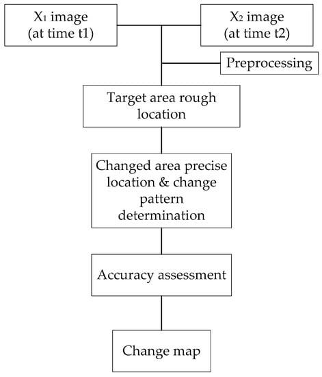 This approach is divided into two main phases: the target area location phase and the target area-processing phase. This study used Landsat 8 OLI images whose spatial resolution is 30 m to execute the change detection.