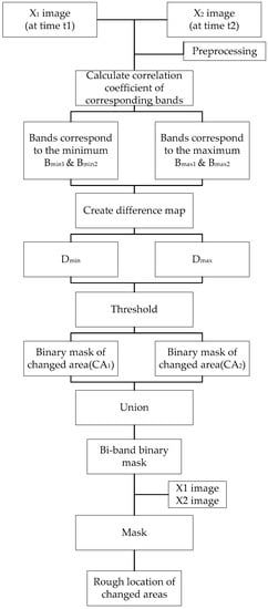 Target area rough location was realized through the use of a bi-band binary mask. The binary mask is derived from the bi-temporal images datasets according to the correlation parameter of each pair of corresponding bands. The binary mask was used to mask out areas with a likelihood of having changed. The detailed process is illustrated as Figure 4.