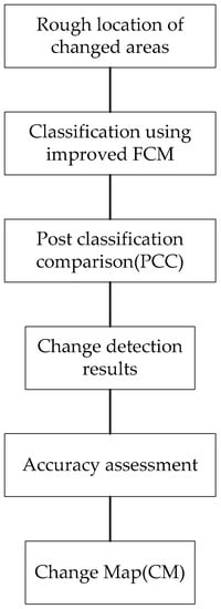 For the precise location of change area, here an improved fuzzy c-means algorithm was used to eliminate false areas in the rough location of changed area. A post classification comparison was executed to determine the change pattern. The flow chart is illustrated as Figure 5.
