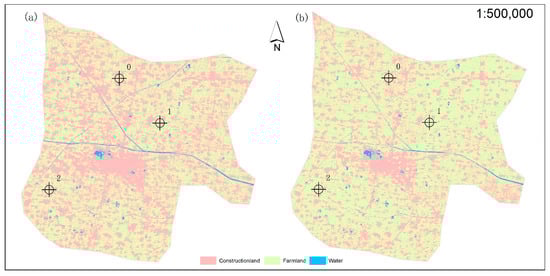 This research refers to the land cover classification system from 2015, and images were first classified into eleven land use and land cover types and to identify potential classes. It is worth noting that some spectral classes correspond to various land use and land cover types with spectral similarities, for example grassland and farmland. Arguably, we followed previous studies [3,44,45], in which similar spectral were assigned to one land use and land cover type, which was of more importance for this research. Considering the local environment of the study area, the former eleven land use and land cover types were combined into three types: farmland, built land and water.