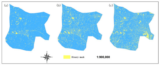 Change detection results: (a) the univariate band binary mask method; (b) the NDVI binary mask method; and (c) the bi-band binary mask method.