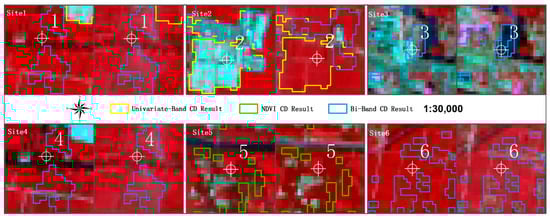 By checking the results of these three methods, there are three sites where the largest differences were found between the univariate band mask and the bi-band mask (site 1, site 2 and site 3), and three sites with the largest differences between the NDVI mask and the bi-band mask (site 4, site 5 and site 6), as shown in Figure 10. Site 1, site 3, site 4 and site 6 illustrate change information detected by bi-band mask method and not detected by the univariate band mask or the NDVI mask method. Site 2 and site 5 illustrate the contrary situation, meaning detected by univariate band mask or NDVI mask method but not detected by bi-band mask method.
