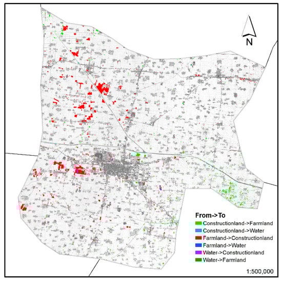 The main changes of land cover happened between built land and farmland. Particularly, the change from farmland to built land is the largest one (14.14 km2). Although part of the built land converted to farmland and water, the results manifest the increase of built land and the decrease of other land cover types in general. Totally, the area of built land increased by 9.03 km2, farmland decreased by 8.92 km2 and the water decreased by 0.12 km2 during the research period. This urbanization process is similar to many cities in China [46,47,48].