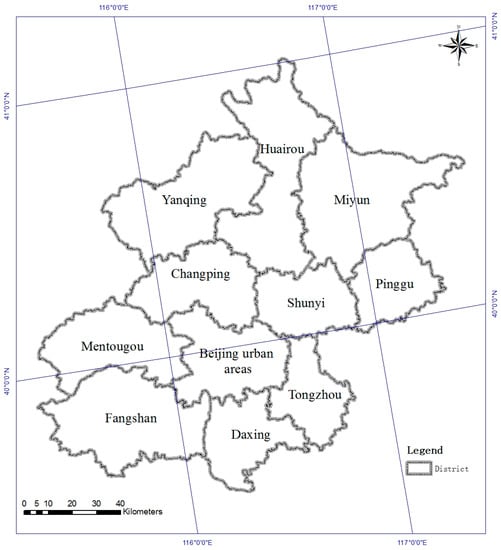 Since the implementation of reform and open policy, the city of Beijing, as the capital of China, has been going through rapid urbanization, and there have been tremendous changes in rural areas of Beijing. Water, as the basis of survival of humans and their surroundings, is impacted by the urbanization of rural areas. Thus, ten rural districts shown in Figure 1 were chosen to explore and study the effects of urbanization on rural drinking water quality in Beijing, China. According to the urban planning of Beijing, Tongzhou, Shunyi, Fangshan, Daxing, and Changping are new urban development districts. Huairou, Pinggu, Mentougou, Miyun, and Yanqing are districts dedicated to ecological conservation.