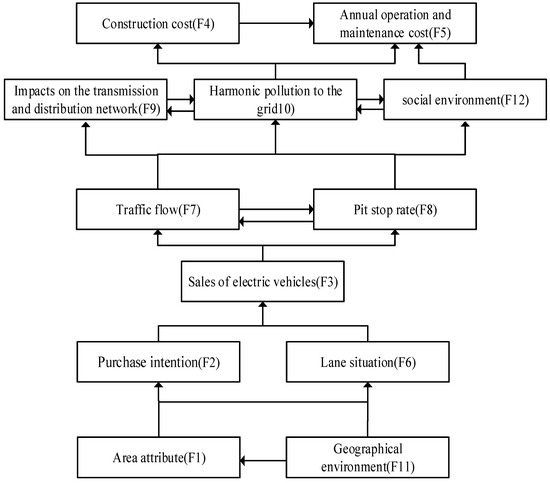 Finally, the structural model is generated from the final reachability matrix. An arrow is applied pointing from criteria to to demonstrate the relationship between them. Removing the transitivity described in the ISM methodology, the digraph could be converted into the ISM model as depicted in Figure 2. The figure shows that area attribute (F1) and geographical environment (F11) are with great significance for the selection of EVCS location as they occupy the basic level of the ISM hierarchy. Construction cost (F4) and annual operation and maintenance cost (F5) are the influence factors on which the effectiveness of the selection of EVCS location depends as they have appeared at the top level of the ISM hierarchy. The digraph and the final model of ISM for the influence factors are shown in Figure 2.