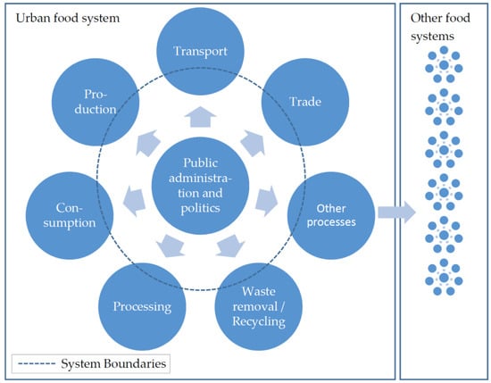 The system boundaries were defined in two steps: First, the general system boundaries of an urban food system were defined to include all food-related processes in the urban area as well as their corresponding actors. This general definition considered all kinds of food-related processes, from production to consumption and waste management. Additionally, processes that are not directly food-related but which impact other food systems (Figure 1), such as financial investments into agricultural systems outside the city, were included in this definition. However, since only part of an urban food system can be influenced by public administration and local politics, the system boundaries were narrowed down in a second step to the (potential) interactions of the mentioned institutions with the processes and actors of the urban food system (Figure 1). This should ensure that the assessment results yield practical suggestions for policy makers on what policies and measures to implement in order to improve the sustainability of the urban food system.