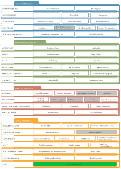 The 21 themes and 58 subthemes of the Sustainability Assessment of Food and Agriculture (SAFA) Guidelines. Those subthemes with grey colored background have been omitted for this study whereas the subtheme Civil Society Initiatives (green colored background) has been added to the existing SAFA subthemes (see Section 3.1.1). Source: Adapted from [22].