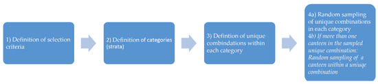 A stratified sampling method was applied for the selection of public-private canteens to interview. The basic selection criterion was that the institutions either needed to be organized directly under public law or have the same function as corresponding public-law institutions (Figure 3, step 1).