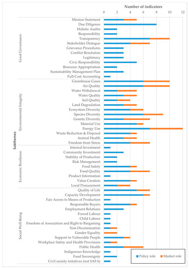 In total, 97 indicators were developed in the participatory process described in Section 2.1.4 (see Supplementary Materials Table S2 for the list of indicators). They are based on two roles of the local politics and administration: The “policy role” considers the activities of the local politics and administration that influence other actors and processes in the urban food system through regulation (and controls), incentives, educational efforts, research, and support of initiatives. The “market role” considers public or public-private canteens to be a direct actor in the food system by purchasing and providing food. The number of indicators that are relevant to the policy role (72) exceeds those which assess the market role (25), which corresponds to the larger set of different public responsibilities in the case of the policy role. The indicators based on the market role mostly operationalize subthemes in the dimension of Environmental Integrity (Figure 4).