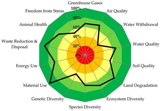 where N is the number of indicators per subtheme, i is the index of the subtheme, IMni is the subtheme-specific weight of an indicator [1,2,3], and ISn is the rating of an indicator (0–100%). The degree of goal achievement accordingly expresses, on a scale from 0 to 100%, the extent to which a subtheme’s sustainability goal was reached. This type of metric was selected to yield meaningful and comprehensible assessment results and to reduce the complexity when comparing between different assessments.