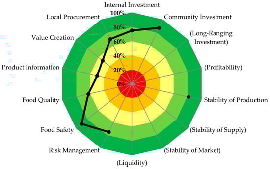 The results in the dimension of Economic Resilience were similar in their range to the scores in the dimension Environmental Integrity (Figure 7). The goal of the subtheme Food Safety was achieved with 90%. The rating is mainly rooted in the risk-based food safety controls along the whole agri-food-chain, for which the results are published online. These controls are complemented by a sophisticated system of ensuring the drinking water quality in Basel.