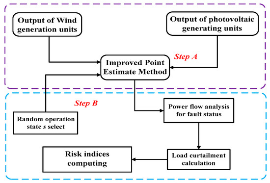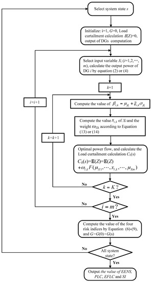 In Figure 2, 2m and 2m + 1 improved-PEM were used, respectively. The output power of DG i is calculated by Equation (2) or (4). Further, OPF was applied to calculate the value of C0(s), which can be referred from Equations (16) and (17). The detailed procedure of the improved PEM-based method for computing risk indices G is summarized as follows.