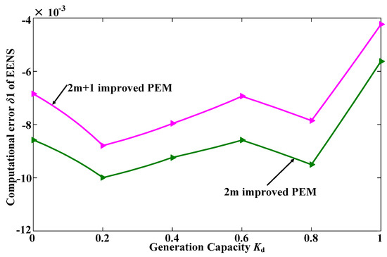In Figure 4 and Figure 5, errors δ1 and δ2 are respectively calculated by comparing the results of EENS and PLC in Table 1 and Table 2 with Table 3. As can be seen from Figure 4 and Figure 5, the maximum value of computational error δ1 is about 0.99% and the maximum value of computational error δ2 is about 0.37%. The computational errors δ1 and δ2 are all less than 1%, which greatly verifies the effectiveness of this improved PEM-based method for risk assessment of distribution systems. Also, the computational error δ2 of PLC is less than the computational error δ1 of EENS. This is because optimal power flow algorithm (based on Equations (15) and (16)) is used in the calculation procedure for EENS.