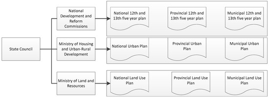 In Chinese urban planning, three types of plans are important for urban and regional development. These are the Five Year Economic and Social Plan, the Urban Master Plan and the Land Use Plan. Specifically, the Five Year Plan reflects the strategic and comprehensive planning for the economic and social development of a city; it is drafted by the National, Provincial and Municipal Development and Reform Commissions (NDRC). The Urban Master Plan elaborates on the spatial structure and urban function of the city by the Ministry of Housing and Urban-Rural Development (MOHURD) at the various tiers of government. The Land Use Plans aim to control land use by allocating land to different functions in a detailed way by the Ministry of Land and Resources (MLR) at the national, provincial and municipal levels [47,53]. All three are relevant to explore the desired brand identity and economic city profiles of GPRD cities. The plans and their issuing institutions in China are shown in Figure 1 (These planning documents of mainland cities in China can be found in a database (The doi of the file in 4TU database is: 10.4121/uuid:ddaabf62-530e-4df2-a0b2-30c75679c7e7)). As for Urban System or Master Plans, we should add here that they are the most important formal documents in urban planning and guide the drafting of detailed plans.