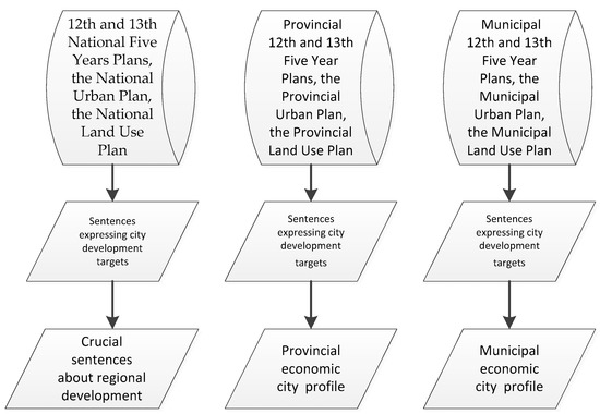 We then collected economic city profiles from the sentences expressing city’s development targets from three parallel documents mentioned above. At the national level, only crucial sentences about regional development of the GPRD as a whole is given by the central government. At the provincial and municipal levels, a collection of economic city profiles in the GPRD was derived from provincial and municipal planning documents. The analytical procedure is presented in Figure 4 and the content of provincial and municipal economic city profiles are shown in the database (The doi of the file in 4TU database is: 10.4121/uuid:ddaabf62-530e-4df2-a0b2-30c75679c7e7).