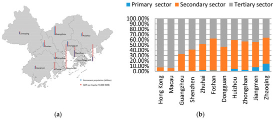 The demographic and economic data of the GPRD cities by the end of 2014. (a) the permanent population and GDP per Capita; (b) the structure of three sectors in GDP for each city.