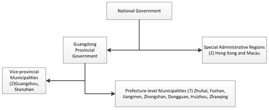 To understand urban development in China, it is necessary to realize that cities operate within an administrative hierarchy, which impacts their administrative power, resource allocation and institutional arrangements [53]. In the GRPD, the eleven cities fall into three different levels, including the special administrative region (SAR), vice-provincial city and prefecture-level city (see Figure 6).