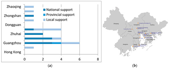 In the four national planning documents (see Section 3.1), we conducted a detailed review of the future development of individual cities. To begin with, in the 12th and 13th Five Year Plan, Hong Kong and Macau receive ample attention from the central government, but the nine mainland cities are hardly mentioned. Hong Kong remains important in its functions for the economic development of the mainland [74]. Hong Kong is referred to quite specifically in China’s 12th and 13th Five Year Plans as being a global offshore RMB business hub, as well as an international finance, trade, and shipping center. As seen above, Hong Kong brands itself as Asia’s World City. Compared with Hong Kong, Macau relies more on mainland guidance, probably because of dependence on growing numbers of tourists from the mainland. Macau is encouraged to become a world tourism and leisure center in the national 13th Five Year Plan, in line with the way Macau brands itself. In the National Urban System Plan and the National Land use Plan, Hong Kong and Macau are not mentioned since they have their independent planning system. As for the mainland cities, they are not mentioned in any of these planning documents at the national level, and only the Pearl River Delta is mentioned occasionally as an important metropolitan region.