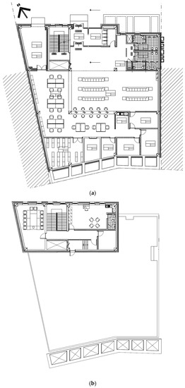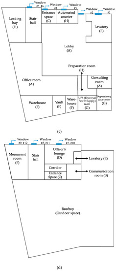 The shape of the building is nearly rectangular and it faces northeast (rotated 34 degrees clockwise from north). This northeast wall is the only wall that contains windows. 250 mm-thick expanded polystyrene board (EPS) is applied as insulation of the aboveground external walls, and 250 mm-thick extruded polystyrene board (XPS) is applied for the underground external walls. The building’s roof has 300 mm EPS board. Each room in the building has a Fan Coil Unit (FCU) or packaged air conditioner, and those terminal units use Ground Source Heat Pumps (GSHP). Each room’s ventilation is served by an Energy Recovery Ventilator (ERV). The building’s plan and EnergyPlus model is shown in Figure 1. The thermal zoning of each floor corresponds to each architectural space (Figure 1a–d).