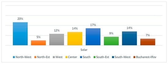We collected data from the northwest region of Romania, one of the eight development regions of Romania, characterized by a low level of urbanization (52% of total population lives in 43 towns) and the existence of a large rural periphery, comprising 1800 villages. In addition, the selected region had a ten-fold increase in the quantity of electricity generated from renewable energy sources in the period 2010–2015 [18]. (We refer to renewable energy sources in this context as to all solar, wind, biomass and micro-hydro power plants (less than 10 MW installed capacity) who are entitled to state support through the “Green certificate scheme”. Hydro power plants with an installed capacity larger than 10 MW, while still considered renewables, are not entitled to a state support scheme and are therefore excluded from our analysis). As shown in the Figure 2, the northwest region is also one of the leading regions when it comes to the shares of implemented solar power projects at the national level. We looked at solar power projects because these were the fastest growing type of projects implemented at the small scale, mostly in rural areas. According to the data from Transelectrica—National Transport System Operator, in northwest Romania—in 2010 there were no registered solar power projects [19]. However, by 2015 there were already 97 working projects located in 68 rural settlements across the region [19].