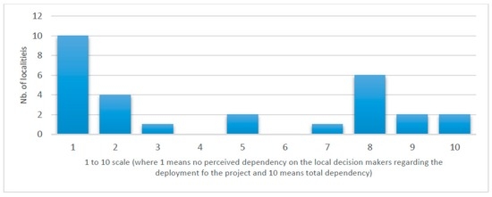 The answers are clustered on two extremities, with 18 villages leaning toward the idea that local decision makers had rather limited impact on the decision to deploy the project, while another 11 perceiving a higher impact on the decision to deploy the project. However, if we contrast the data from Figure 6 with the answers local authorities gave once asked what was their specific leverage on the project, we can see that it is strictly reduced to the legal permits they had to remit.