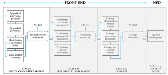 Due to its simplicity and versatility, the stage-gate model provided by Cooper [29] appears appropriate for the present case. Although it is a simple linear model, it remains one of the most referred to tools in innovation management. Within this model, the innovation process is systematically structured into three FEI stages (idea, preliminary assessment, and concept) and one NPD stage (development). Within each stage, activities are performed and an evaluation of the results is carried out. At various decision points (gates), the current status of the innovation-project is evaluated in terms of established criteria. Depending on the results of the evaluation, one then either proceeds to the next task or abandons the whole project [29]. The basic structure of the stage-gate model with different stages and gates is suitable for use in analyzing by-product innovations. However, the use of waste/by-product as a substitute for raw materials represents a relatively specific case, and thus requires some adjustment of the standard model. Figure 1 shows the resulting theoretical framework.