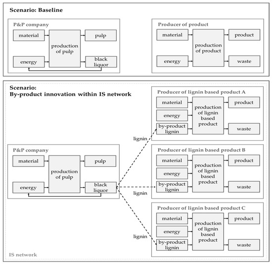 Baseline versus by-product innovation within an IS network for lignin utilization. The baseline scenario shows the current status quo: P&P companies using the black liquor as a fuel for the production of energy; manufacturing companies produce their products in a classic way, by the use of virgin material (for simplification just one producer is exemplified). The by-product innovation scenario is designed to outline the resulting IS network. Within manufacturing companies, the previously used virgin material is substituted (at least partially) with the by-product lignin that is isolated from black liquor. In order to assess the value of such a symbiotic formation, the entire IS network, including the lignin producing P&P company, as well as the producers of lignin-based products, needs to be taken as the unit of analysis for the case study.