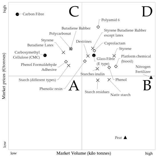 In order to facilitate the selection of the most promising IS innovations for the by-product lignin, we summarized the results within a portfolio matrix approach (see Figure 3). Within this portfolio, the global market volumes of the potential areas of substitution are plotted on the horizontal axis, while the respective average world market prices are to be found on the vertical axis. For both axes, an estimation is made from low to high. Adhesives are represented by a diamond, binders by a cross, fibers by a dot, and soil conditioners by a triangle. The figure ignores those products for which no global production volume could be determined. The four quadrants of the portfolio show which IS innovations promise the greatest potential success for the by-product lignin (these are thus to be analyzed in more detail in the next stage (preliminary assessment) of the stage-gate model of self-organized IS innovations), as well as which IS innovations may be neglected.