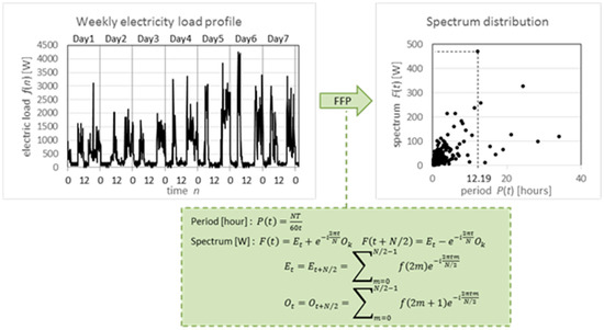 Ozawa et al. [47] developed two kinds of electricity data analysis methods to investigate relatively detailed variations in load profiles for a specific period of the year (for one week or one month); the purpose was to demonstrate the relationship between household electricity consumption and lifestyle. With the first method, the authors performed a frequency analysis of the weekly load profiles of individual households; they classified 1072 households according to the highest peak in the spectrum distribution. The households were divided into groups based on the representative frequencies, which were calculated for each household. Figure 1 shows an example of the frequency analysis. The authors found that the representative frequencies for over 75% of the households were a 12-h or 24-h period. Ozawa et al. found that the households in the 12-h group had a morning-oriented lifestyle and consumed on average 5.3% less electricity than households in the 24-h period group, which had a night-oriented lifestyle. A morning-oriented lifestyle also has health benefits [55,56,57], which can be viewed as a (2-3) motive for changing behavior. With the second method, Ozawa et al. performed a cluster analysis of each household’s daily load profiles to determine the typical load pattern. From the cluster analyses, various load patterns and the corresponding dates for each load pattern were obtained. For each household, the load pattern when the household followed a regular routine for the month was defined based on the most common pattern for that month. Figure 2 shows an example of the cluster analysis. Based on an index evaluating the validity of clustering, Ozawa et al. noted that the best cluster analysis could be performed for each household when using the complete linkage method and with five clusters. They also found that most of the 1072 households consumed less electricity when they followed a regular routine. Households can activate their own (2-1) “personal norms” by reflecting on their daily life and electricity consumption. Figure 3 summarizes the assumed causal connections between norms or motives and feedback obtained through an analysis and comparison of household electricity consumption.