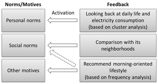 Better understanding of the theoretical background to the causal relationship between energy consumption and feedback is important for increasing household engagement. Using a psychological model to explain the relationship between environmentally relevant behavior and information, Fischer [6] explained how and why feedback on electricity consumption contributes to conserving electricity. Two processes change individual habits into environmentally friendly behavior. Termed norm activation, the first process requires an individual to raise three types of consciousness: (1-1) consciousness of issues; (1-2) consciousness of the relevance of the individual’s behavior to the issues; and (1-3) consciousness of the individual’s possibilities of changing their behavior. When norm activation is accomplished, an individual is able to undertake norm evaluation and decision making. In the second process, different behaviors are evaluated based on the following: (2-1) personal norms; (2-2) social norms; and (2-3) other motives. Individuals make this evaluation to choose the behavior that maximizes the sum of the norm values.
