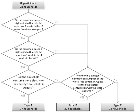 Feedback reports were furnished by gathering data about the 78 households’ electricity use for each 30-min period (kWh/30 min) from 1 May to 30 August 2015. A 30-min time interval is the basic specification required for smart meters in Japan [58]. Electricity demand data measured during each 30-min period have been also used in the feedback demonstrations in Japan [20,30]. A feedback report and a questionnaire were sent to 78 households on 28 September 2015. The methods of Ozawa et al. [47] were applied to derive the report content for each household from the 30-min electricity demand data of the household. First, a frequency analysis of the household’s weekly load profile was performed. If the spectrum distribution of the weekly load profile showed its greatest peak with a 24-h period, it is determined that the household had a night-oriented weekly lifestyle. Conversely, if the distribution displayed its highest peak with a 12-h period, it is determined that the household had a morning-oriented lifestyle. A type A report was sent to households that satisfied the following conditions: (1) the household spent a night-oriented lifestyle for over seven weeks in the 13 weeks from June to August; (2) the household spent a night-oriented lifestyle for more than one week in the four weeks in August; (3) the household consumed more electricity than the average household in August. Second, for each household except those in the type A group, a cluster analysis of the daily load profiles in August was performed to classify them into one of five patterns, and the typical load pattern of the household was identified. If the daily average electricity consumption of the typical load pattern was less than the average consumption with the other patterns, a type B report was sent. Finally, a type C report was sent to the remaining households. Figure 4 is a flow chart showing how the three types of reports were sent to each household.