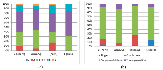 With the questionnaire enclosed with the feedback report, recipients were asked about their characteristics with respect to personal attributes and home energy use. It should be noted that five of the 78 households that received a feedback report failed to respond. Figure 5a shows the composition of the recipient families. The average numbers of family members were as follows: all, 3.70; type A, 3.68; type B, 3.66; and type C, 3.80. Figure 5b displays the recipient’s family type composition: 74% of the recipients were couples with children. The composition by report type was similar among the recipient families.