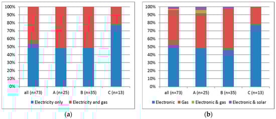 Figure 6a shows the type of energy utility; Figure 6b presents the type of water heaters used in the recipient homes. About half of the recipients’ homes were all-electric and used electric heaters; the other half used both electricity and gas, employing gas heaters. In a comparison of households by report type, type C households tended to be all-electric.