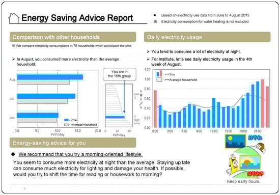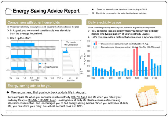Feedback about electricity consumption is a promising utilization of electricity-use data from smart meters to enhance end-users’ responsiveness, thereby reducing their electricity consumption [4]. Among practical studies of electricity feedback, various types of feedback to households have been provided over recent decades [5]. Most feedback offers information on the recipients’ real-time or previous electricity consumption and conservation activities; however, the effect on electricity conservation differs according to the approach adopted [6]. Recent studies based on psychological methods [6,7] have revealed the importance of personalized information to increase household engagement and reduce household energy consumption. Although some empirical studies and feedback reports were conducted by power companies and public institutes [8,9,10], those studies have not focused on household lifestyle, an important aspect for feedback personalization.