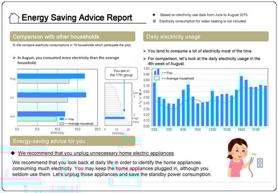 In order to measure and verify the effect of feedback reports, a few collaborative projects have been also carried out by utility companies and public institutions. For example, Pacific Gas and Electric Company, an electric utility in the United States, sent home energy reports to the residential customers and assessed the impact of behavioral demand response on peak electricity usage on four designated “Summer Saving Days” [8]. In Japan, Jyukankyo Research Institute conducted a home energy report pilot study on 41,200 Hokuriku Electric Power Company’s customers [9]. The advice in home energy reports in the USA and Japan was made on the basis of monthly electricity consumption. The Energy Demand Research Project (EDRP) in the United Kingdom was carried out to test consumers’ responses to different forms of information about their energy use. About 61,300 customers of four British power companies (EDF, E.ON, Scottish Power, and SSE) participated in the EDRP, and the impact of energy efficiency advice (not personalized to the customer) on annual energy reduction was measured [10].