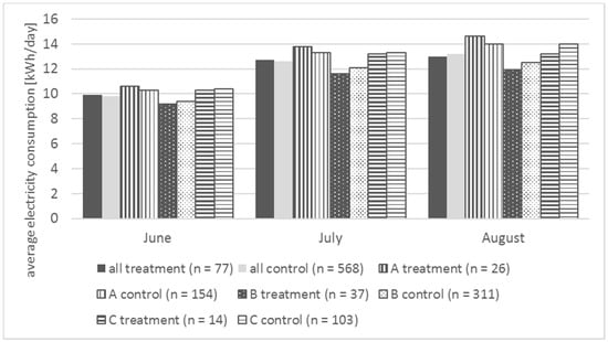 Figure 10 shows the comparison results of the daily average electricity consumption of the treatment and control groups before the feedback (June to August 2015); the electricity consumption of the two groups was similar.