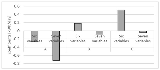 To determine which household was most influenced by a type B feedback report, a regression analysis between the features of households’ electricity consumption and the feedback effect was performed. The regression formula is given in Equation (9), where (kWh/day) is the daily average electricity consumption of a typical load pattern in August, (kWh/day) is the daily average electricity consumption of a consuming load pattern in August, and is the ratio of electricity consumption of the typical load pattern and consuming load pattern: