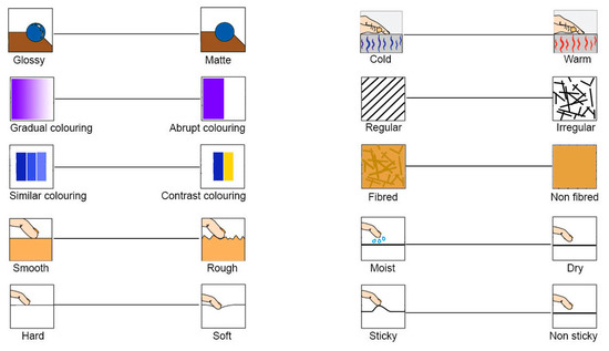 In order to construct the sensorial quality set, we adapted the expressive-sensorial atlas of Rognoli [46], the sensorial scales of Karana [34,47], and the Matrix of Zuo [48]. In these earlier studies, a number of sensorial qualities were found as the most commonly used qualities to describe materials. For example, Karana [34] conducted a series of user studies through which she collected above 300 sensorial descriptive items (e.g., smooth, slippery, and sticky) that are used by people to describe how a material touches and feels. She analysed these descriptions and revealed the most frequently and commonly used descriptions, which constructed the sensorial scales she introduced in Karana et al. [47].
