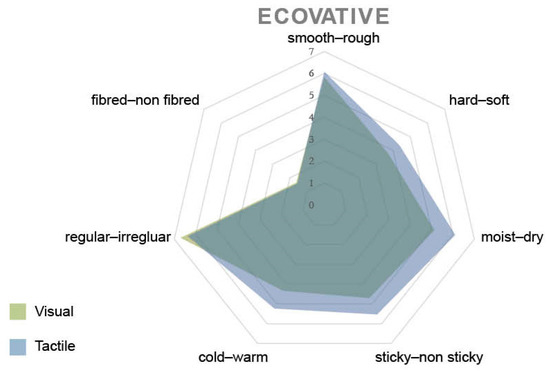 In Study 2, we wanted to explore this argument further. In order to do so, we first developed new material samples based on our findings presented in Table 6. We challenged ourselves by selecting the ugliest samples (according to the results obtained in Study 1), and argued that even such a material, which was initially appraised as ugly, when modified based on our results, could be perceived as beautiful. Likewise, a beautiful material might be perceived as ugly when modified in accordance with our results. Accordingly, we manipulated the visual and tactile qualities of two revived materials: Ecovative (Sample 2, Figure 3), which was assessed as the ugliest material, and Goodhout (Sample 3, Figure 3), which was assessed as one of the most beautiful materials in Study 1. Figure 7 shows the ratings of Ecovative from Study 1. The material was perceived as rough, hard, dry, non sticky, warm, irregular and fibred. Figure 7 also shows that the visual and tactile appraisals for this particular material were quite similar. Figure 8 shows the ratings of Goodhout from Study 1. In comparison to the Ecovative sample, there is significant contrast between the visual and tactile ratings of the Goodhout sample. By modifying their sensorial qualities, we aimed to achieve two samples of the same material; one with similar visual and tactile qualities and the other one with contrasting visual and tactile qualities.