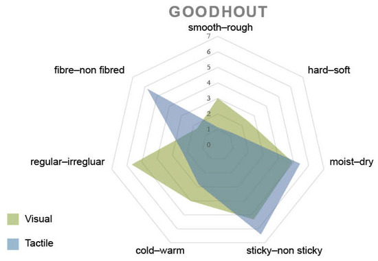 Goodhout samples scored significant for both similar-contrast and expected-unexpected in the Wilcoxon signed-rank test (Table 7). The similar-contrasting perception of the material was significantly higher for the Goodhout Contrasting (GC) sample (Mdn (median) = 5.0) than the Goodhout Similar (GS) sample (Mdn = 2.0, Z = −3.658, p = 0.000). The expected-unexpected rankings were also significantly higher for the Goodhout Contrasting sample (Mdn = 5.0) than the Goodhout Similar sample (Mdn = 2.0, Z = −4.487, p = 0.000). This means that the Goodhout Similar sample, which was intended to have congruent visual and tactile qualities, was perceived as “similar”. The Goodhout contrasting sample was also assessed as intended, i.e., as “contrasting tactile and visual qualities”. Following these results, we analysed the Goodhout samples further as they were appraised as intended. Ecovative samples (Ecovative Similar; ES, Ecovative Contrasting; EC) were not analysed further as the Wilcoxon test reported the comparisons were not significant at p = 0.050 level (Table 7).
