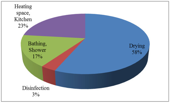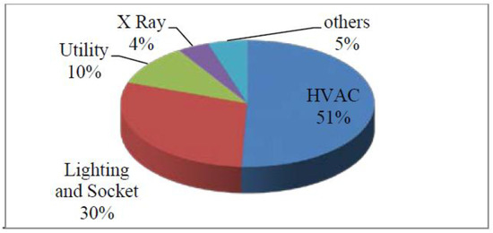 Hospitals are enormously complex buildings with many unique requirements. Architects and owners of the hospitals often overlook energy usage because they are so focused on meeting the hospital’s numerous other requirements. The power consumption distribution of the facility system in a typical hospital shown in Figure 1 indicated that the heating, ventilation, and air conditioning (HVAC) system was the highest power-consuming unit. As shown in Figure 2 [1], the use of wash and dry contribute 58% of total fuel consumption; heating and kitchen use contribute 23%, and the use of shower contribute 17% of total fuel consumption. In the study of Bonnema et al. [2], a comparison of energy use intensities of the hospitals across all U.S. climate zones showed that the energy saving has the better potential in the marine climates than in the climates of cold or dry. The eleven energy design measures were conducted while the heat pumps shared a common condenser loop whose temperature was maintained though the use of a chiller and boiler and attained 50% energy savings in their study.