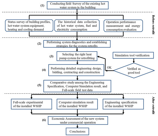 In this study, an analytical methodology has been developed for retrofitting a central hot water supplying system in a large general hospital, by integrating a newly-added water source heat pump with the existing air-conditioning system. The procedure consists of performing the jobsite system diagnostics, developing a corresponding retrofit strategy, and performing computer simulation to evaluate its effectiveness, followed by full-scale experiment to validate the results.