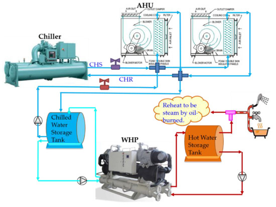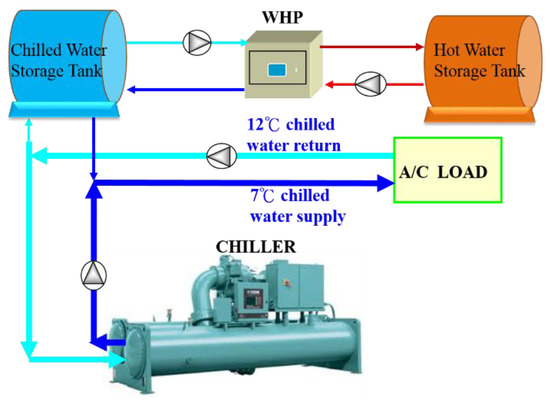 - Figure 4 shows the parallel integration of a chiller and a WSHP with an appropriately-sized chilled water storage tank. The merit is that the cooling capacity generated by the WSHP can be stored continuously in the chilled water storage tank, ensuring a steady heap pump operation. On the contrary, even when the WHSP was shut off temporarily, the HVAC system can work as a chilled water storage system, or use off-peak power to reduce the power tariff.