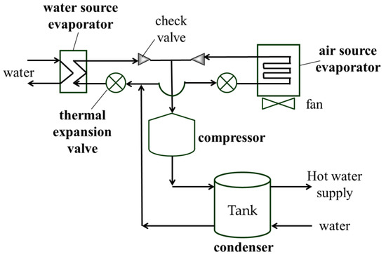 - To meet the seasonal heating and cooling requirements simultaneously, a dual-source heat pump system, using both air and water as energy sources, is a good choice [12]. The evaporator can switch to the air source mode and eject the energy to the ambient when cooling load is lower, as shown in Figure 5. However, the heat pump will suffer from a lower COP under air source mode and the risk of failures may increase because of the frequent switching of the magnetic valves, which could easily become jammed and/or cause leakages, demanding much maintenance work.