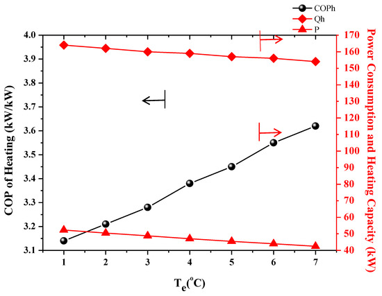 Table 2 indicates the comparison of both results. The Qe deviated by 0.3%, the Qh deviated by 0.3%, and the system COPh and COPc deviated by 0.5% and 1.1%, respectively, all falling within engineering tolerances. The simulation result is also plotted in Figure 7 where the x-axis denotes the refrigerant specific enthalpy and the y-axis denotes the refrigerant pressure; it is the ph diagram, or Mollier Diagram.